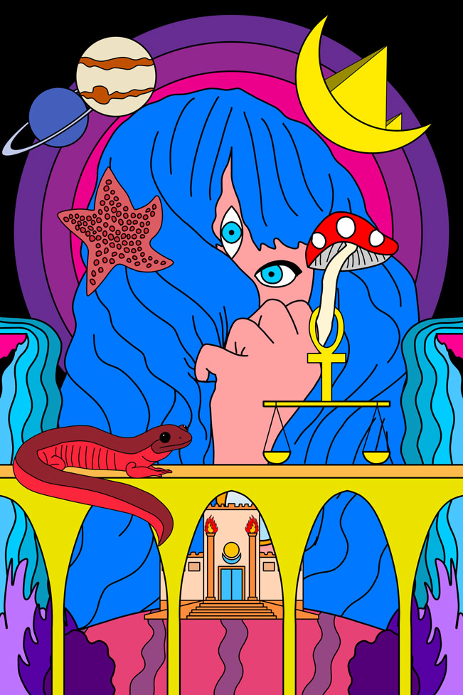 Around her head are different objects, this was inspired by Hindu deities holding symbolic objects in their hands. The crescent moon and pyramids represent the astonishing sense of awe felt encountering this energy. The mushroom, ankh and scales represent the vital flow of life and nature, and the divine justice governing it. The Starfish is a representation of the element of water and the mysterious feel of an ocean which the female figure contains. Saturn and Jupiter aligning is representing the sense of balance that is provided while this energy is flowing freely.